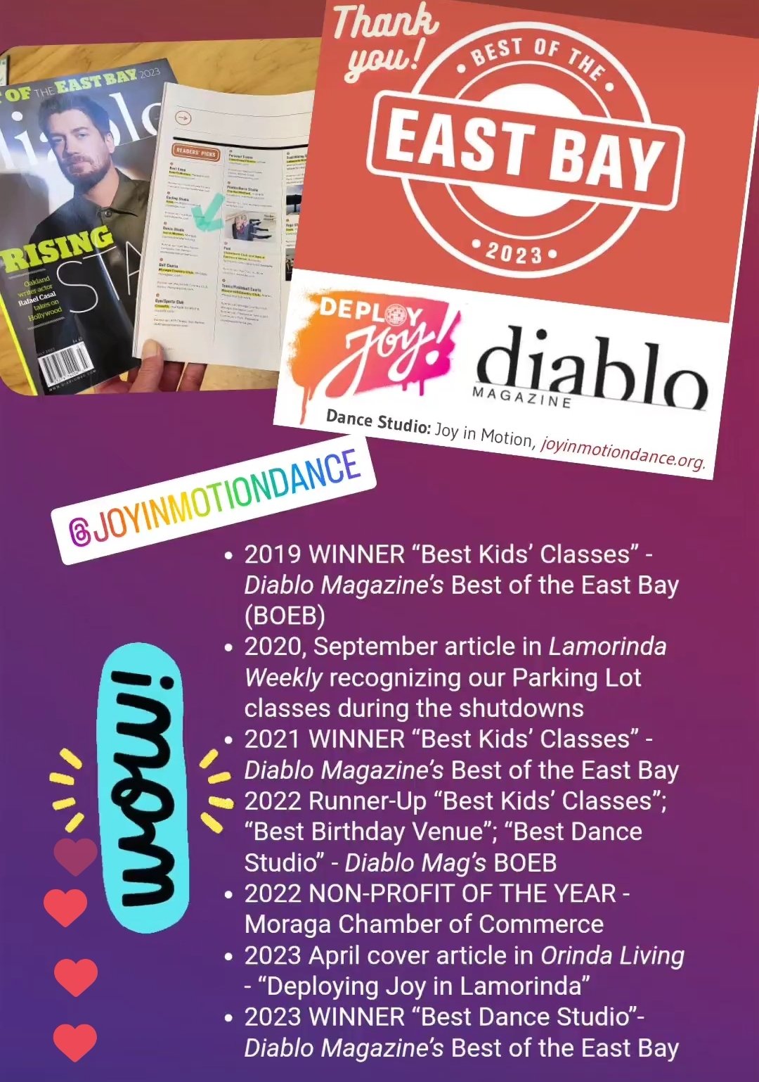 "I’ve never been at a dance studio [like Joy in Motion] in which the students were so incredibly happy to be there, from the littles to the adults. The joy radiates from the building. Love them!"